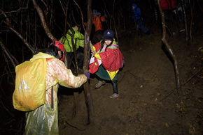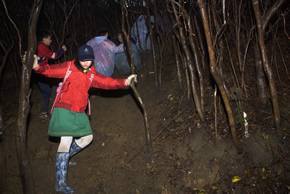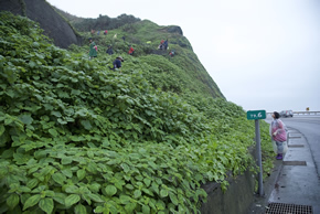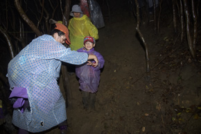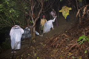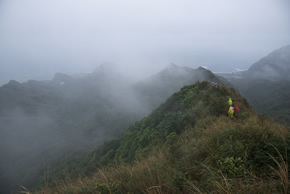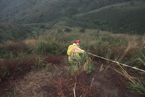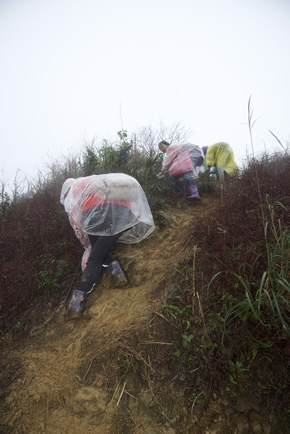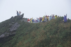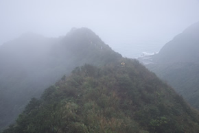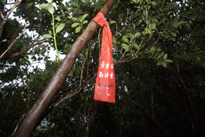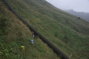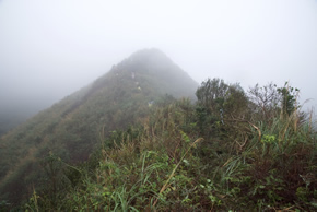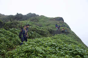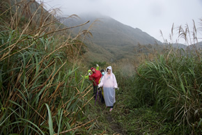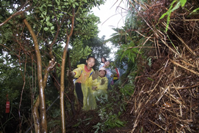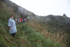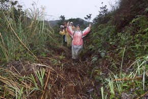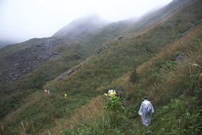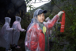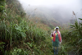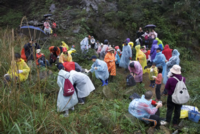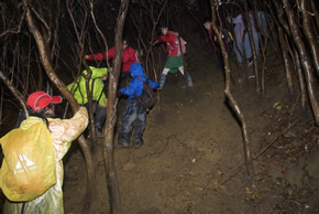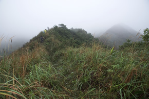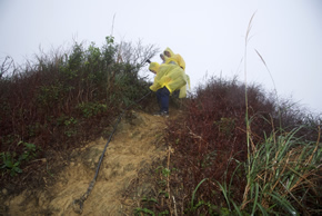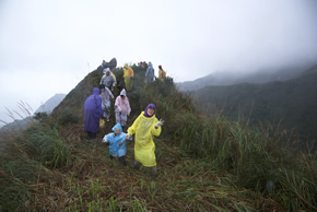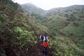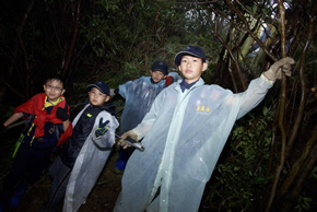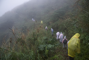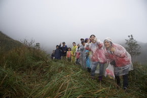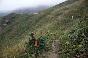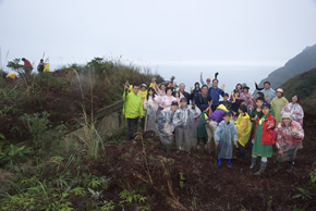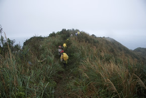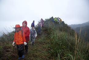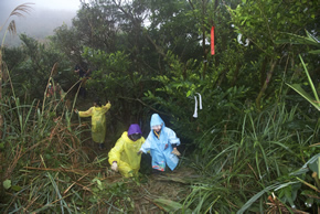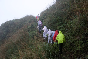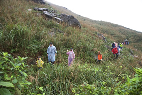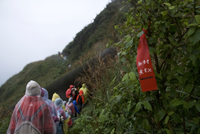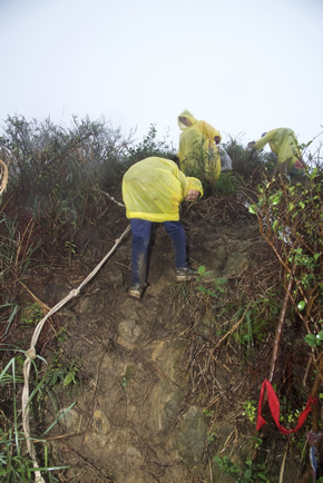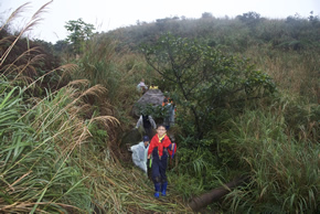 事實上,先遣部隊已多次上山,清除了芒草(有刺的菝契、懸鉤子近路邊的也除),12/13大家只要幫忙綁登山布條,作階梯、撿垃圾……就可以了,當然也順道訪視待援坪頂(此山頭較光禿,那天遇事時風停雨歇,月光來相助,我們叫它光明頂)。